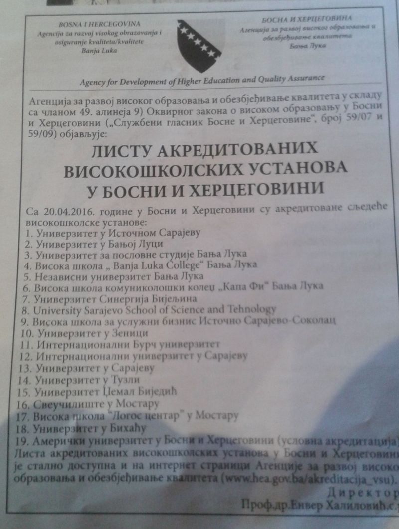 U dnevnim novinama u BiH Agencija za razvoj visokog obrazovanja i obezbjeđenje kvaliteta BiH objavila je spisak akreditovanih visokoškolskih ustanova BiH.
