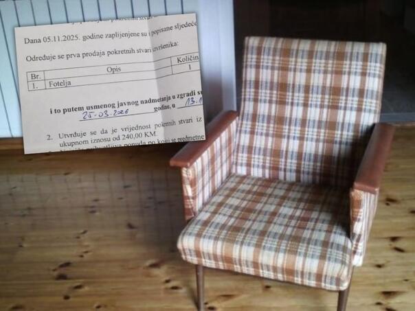 Prema sudskom dokumentu od 4. marta 2026. godine, sud je odredio prodaju zaplijenjene imovine izvršenika, a riječ je o jednoj fotelji procijenjenoj na 240 KM.