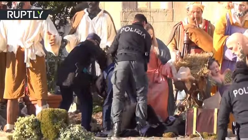 Fotograf Reutersa je izjavio da je žena bez majice preskočila ogradu i uputila se ka prikazu Kristovog rođenja uzvikujući “bog je žena!”, slogan koji je bio ispisan na njenim leđima.