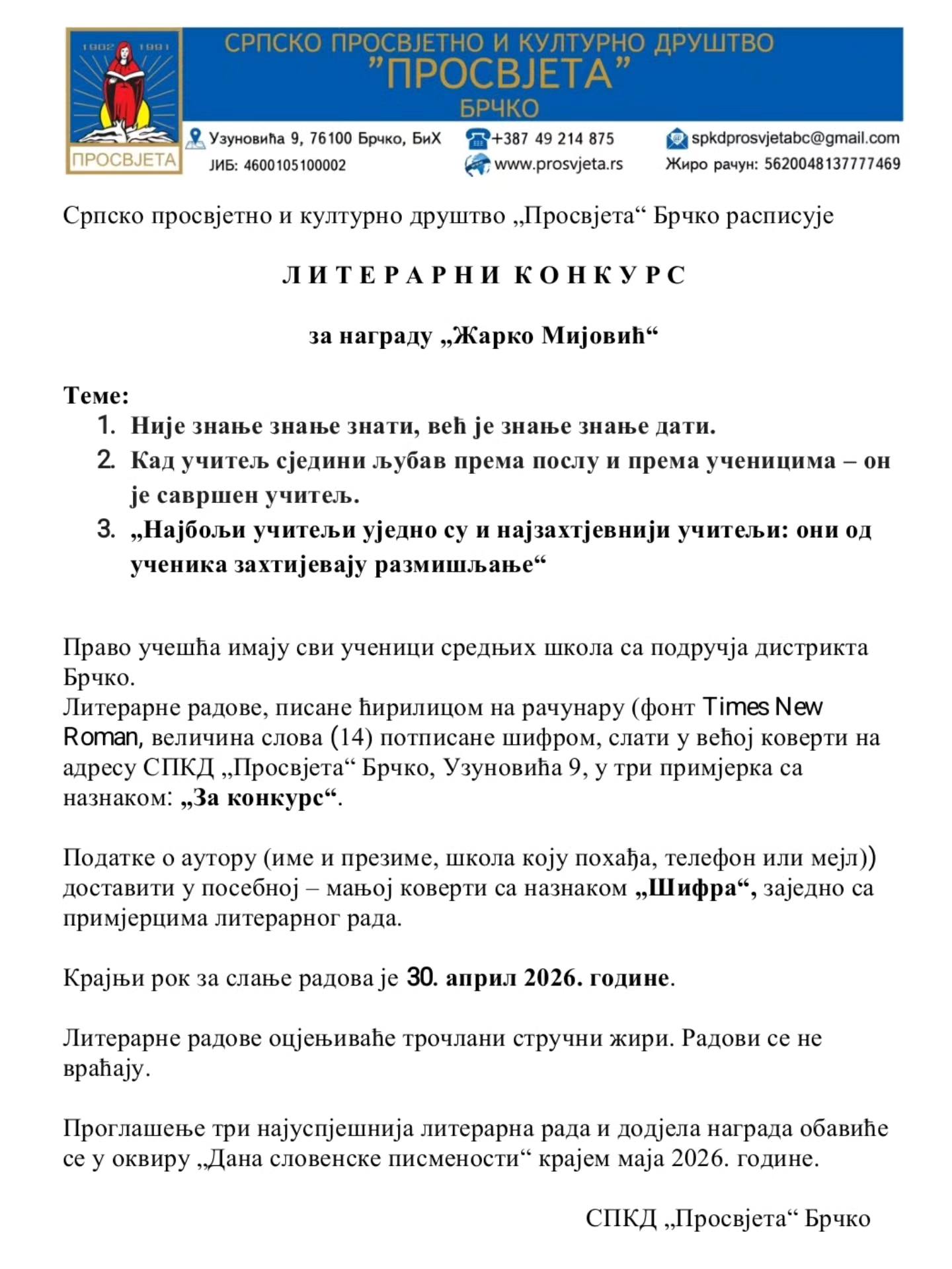 Српско просвјетно и културно друштво „Просвјета“ Брчко расписало је литерарни конкурс за награду „Жарко Мијовић“, намијењен ученицима средњих школа са подручја Брчко дистрикта.