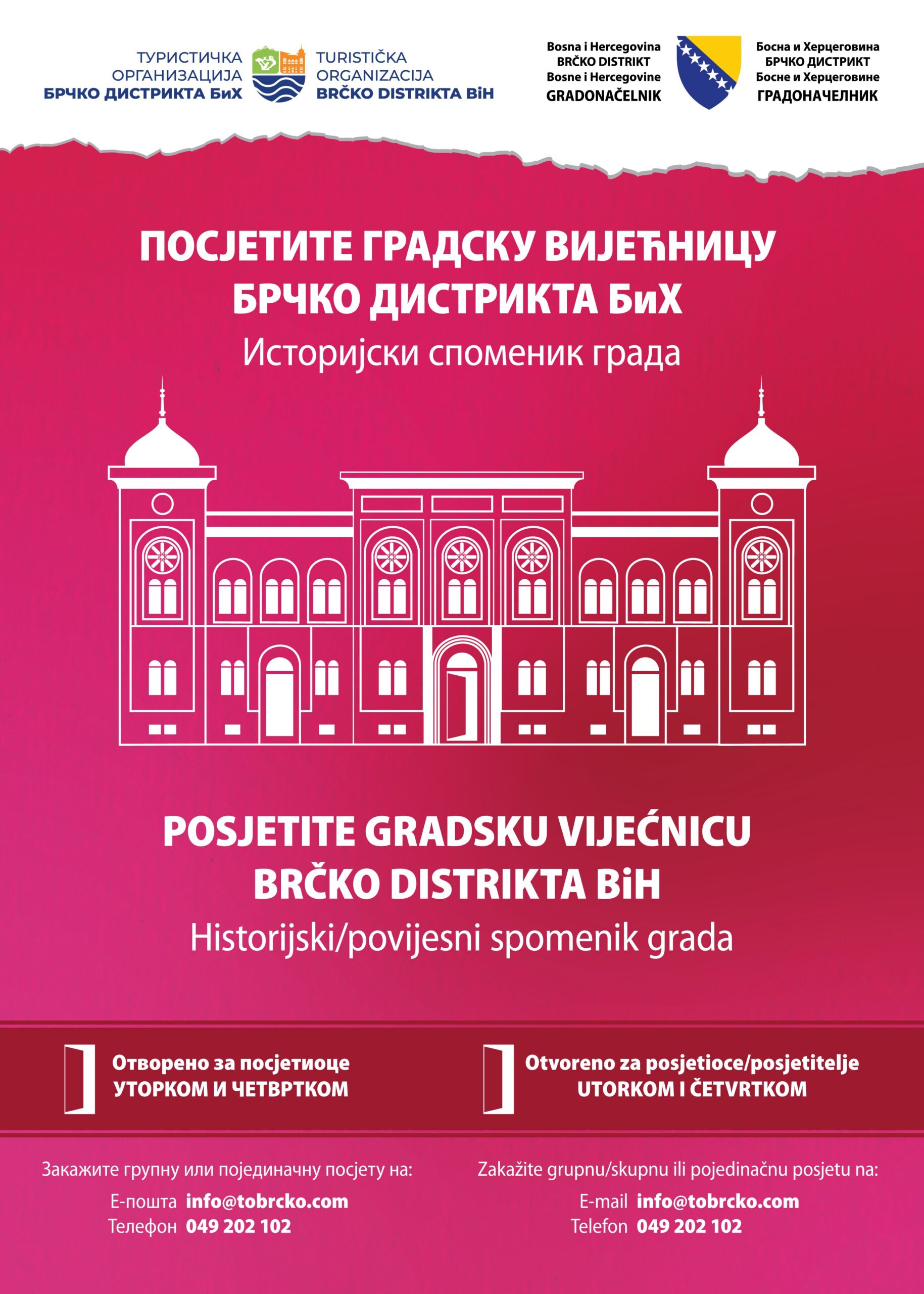 Кабинет градоначелника Брчко дистрикта БиХ у сарадњи са Туристичком организацијом Брчко дистрикта БиХ отвара врата Градске вијећнице за посјетиоце.